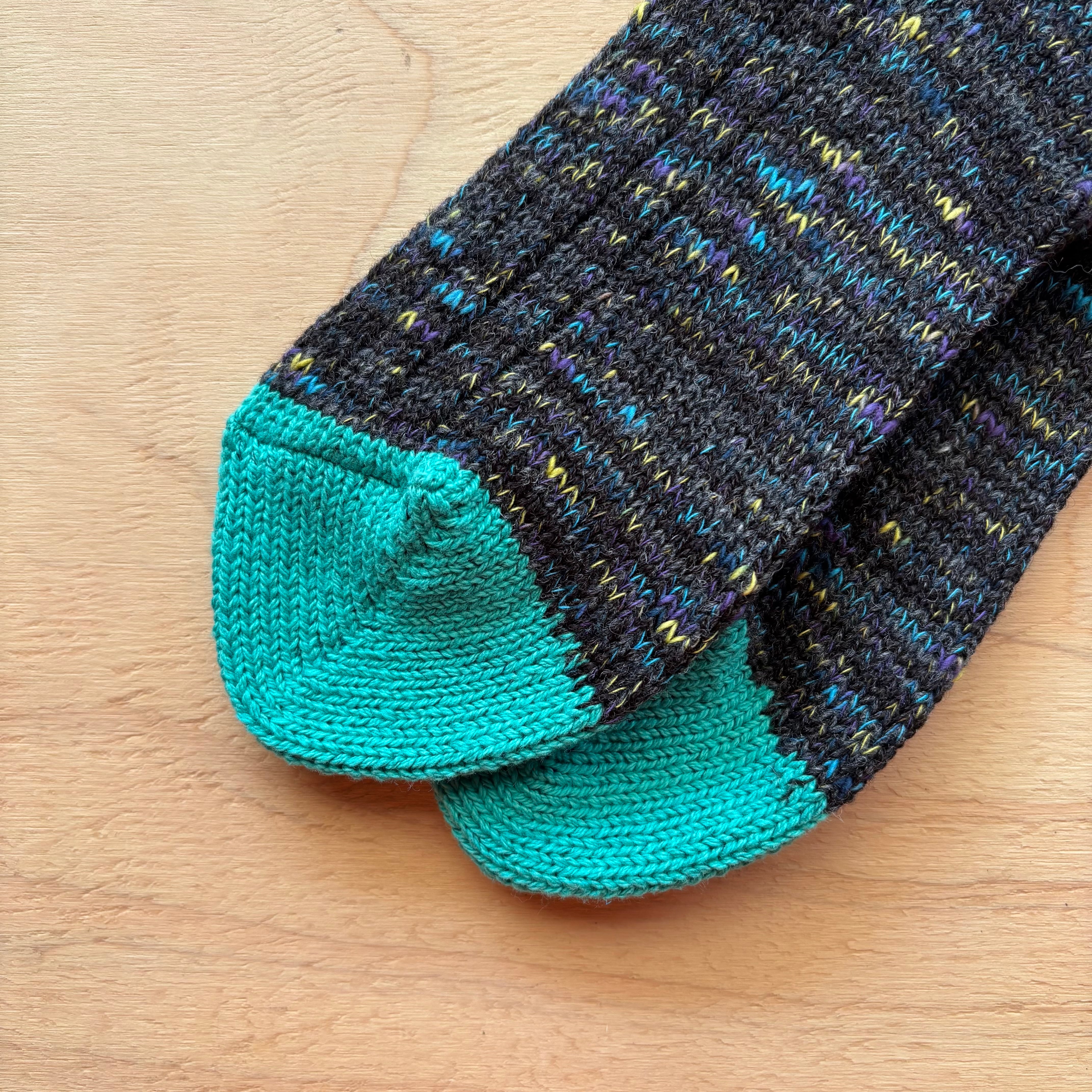 摩擦が起こりやすいつま先とかかと部分には、リサイクルコットンを使用し、耐久性に配慮されています。カラフルな絣(かすり)の糸がほんのりアクセント。