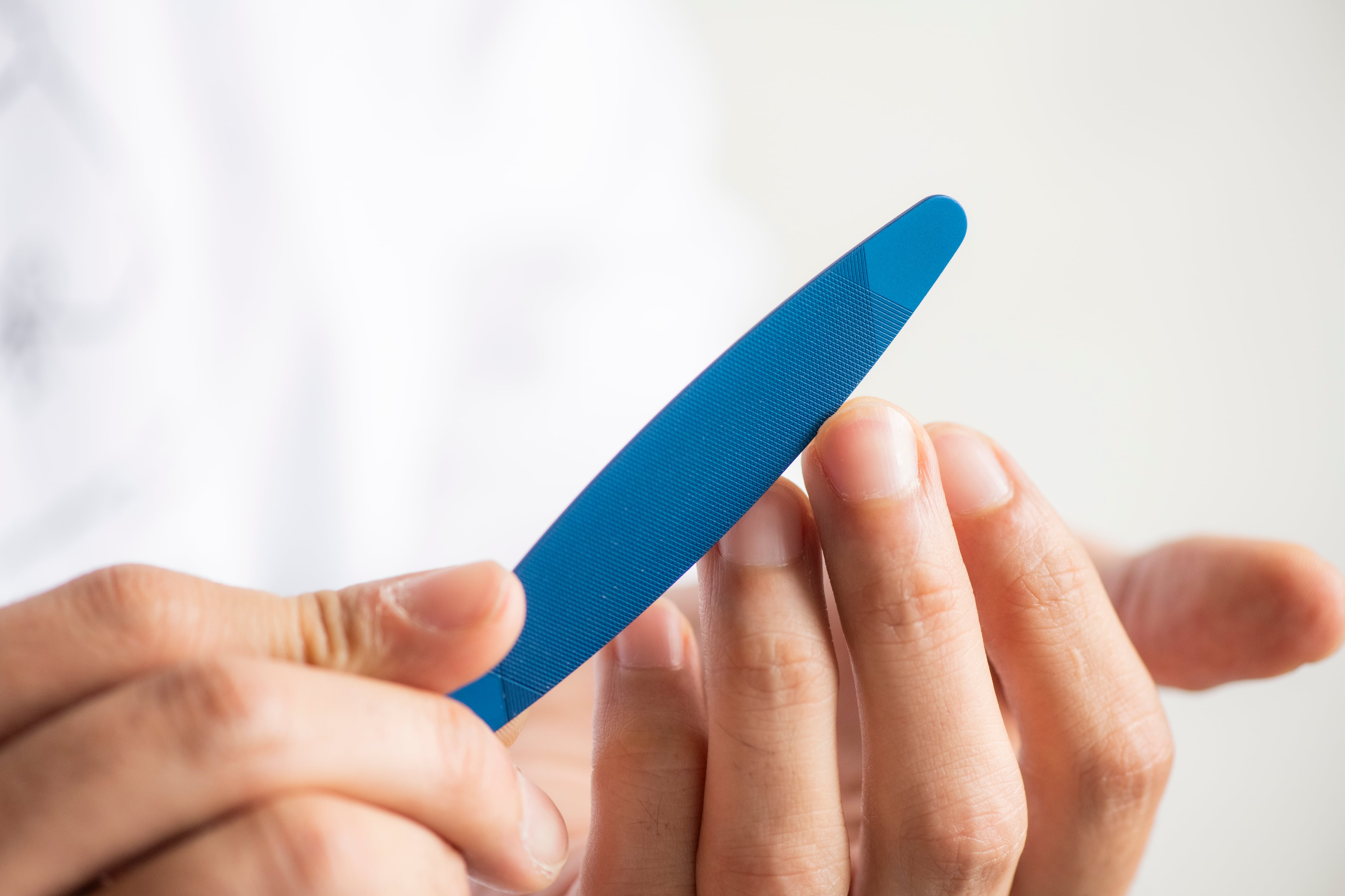 穴が開いていない方を下にして、引いて動かすと“引き削り”が可能。逆に向けて持てば“押し削り”にも対応。左右対称のシンメトリーデザインだから、どちらの使い方でもフィットする設計になっています。爪のケアがぐっと身近になる相棒のような一本です。